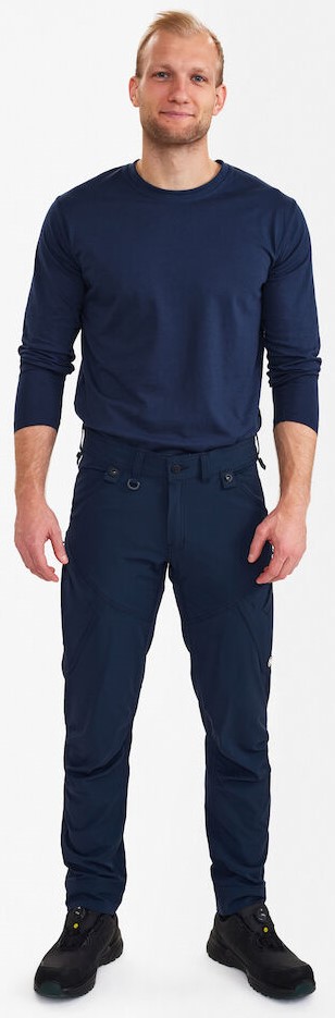 Funktionelle Servicehose mit vielen funktionellen Details. Der Stoff ist mit bequemem 4-Wege-Stretch für bessere Passform und mehr Bewegungsfreiheit und für maximalen Komfort mit Baumwolle auf der Innenseite ausgestattet. Die Hose hat einen ergonomisch geformten Kniebereich. Zwei geräumige Schrägtaschen vorne. Zwei Gesäßtaschen. Zwei Schenkeltaschen mit Reißverschluss. Die linke Schenkeltasche hat eine zusätzliche Handytasche. Die rechte Schenkeltasche hat Falten für zusätzliche Weite und eine Innentasche. D-Ring vorne für die Befestigung von z. B. Ausweisen. Breiter Saum unten, der ausgelassen werden kann, wenn zusätzliche Beinlänge erforderlich ist. Um die Hose zu verlängern, muss lediglich eine Naht aufgetrennt werden. Das Hosenbein ist trotzdem noch gesäumt.