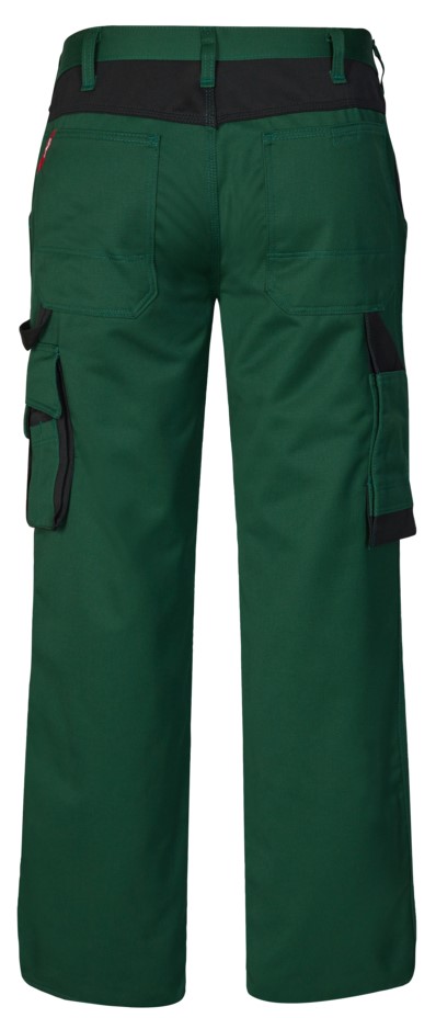 Arbeitshose mit dreifachen Kappnähten und Bundfalten. Zwei Eingrifftaschen und eine Münztasche. Hosenschlitz mit Metallreißverschluss. Dunkel gefärbter Metallhosenknopf. Zwei verstärkte Gesäßtaschen, die Rechte mit Klettverschluss. Verstärkte Zollstocktasche mit Dehnfalte rechts. Schenkeltasche und Handytasche mit Dehnfalten und Patte mit Klettverschluss und zusätzlichen Bleistifttaschen links/Hammerschlaufe links. Knietaschen/Knieverstärkung mit Klettverschluss sowie zwei Verstellmöglichkeiten für eingelegte Kniekissen. Für Industriewäsche geeignet.