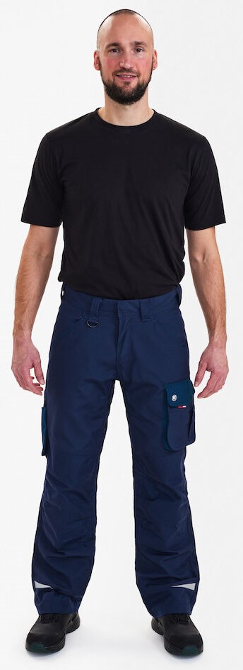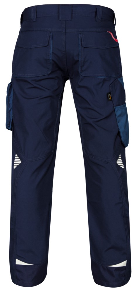 Funktionelle Arbeitshose mit vielen Details. Optimale Passform, u. a. sorgen ergonomisch geformte Knie und Panel an der Innennaht im Schritt für mehr Bequemlichkeit. Zwei geräumige, schräg sitzende Einschubtaschen vorne. Schlaufe mit D-Ring (vorne) zur Befestigung einer ID-Karte. Zwei geräumige Gesäßtaschen mit Patte und Klettverschluss. Schenkeltasche mit Reißverschlusstasche fürs Handy, zusätzliche kleine Tasche. Sie ist geräumig und sorgt dank des freihängenden Bodens für mehr Bewegungsfreiheit. Unten verstärkte Zollstocktasche mit zusätzlichen Fächern. Auch die Zollstocktasche hat einen freihängenden Boden. Knieverstärkung/Knietasche mit Klettverschluss unten sowie zwei Einstellmöglichkeiten für Knieschutzkissen. Verstärkter Saum der Hosenbeine hinten und vorne für extra hohe Verschleißfestigkeit. Reflexstreifen an den Knien und unten an den Hosenbeinen für mehr Sichtbarkeit. Für Industriewäsche geeignet.