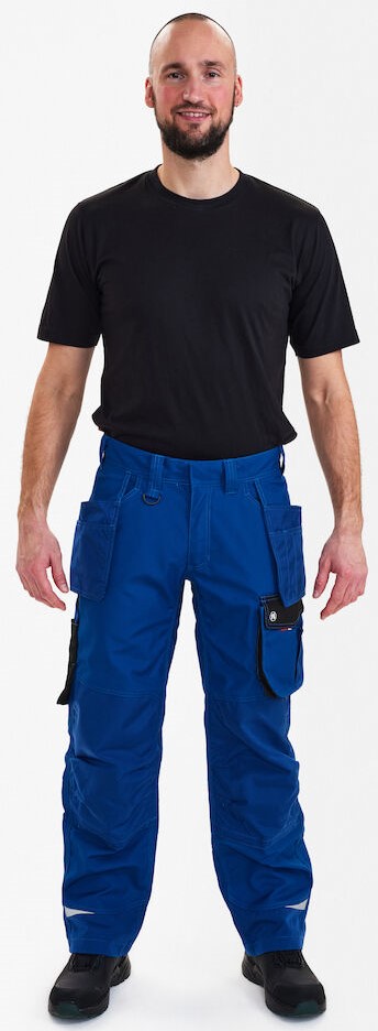 Funktionelle Arbeitshose mit vielen Details. Optimale Passform, u. a. sorgen ergonomisch geformte Knie und Panel an der Innennaht im Schritt für mehr Bequemlichkeit. Zwei geräumige, schräg sitzende Einschubtaschen sowie zwei Holstertaschen vorne. Schlaufe mit D-Ring (vorne) zur Befestigung einer ID-Karte. Zwei geräumige Gesäßtaschen mit Patte und Klettverschluss. Schenkeltasche mit Reißverschlusstasche fürs Handy, zusätzliche kleine Tasche. Sie ist geräumig und sorgt dank des freihängenden Bodens für mehr Bewegungsfreiheit. Unten verstärkte Zollstocktasche mit zusätzlichen Fächern. Auch die Zollstocktasche hat einen freihängenden Boden. Knieverstärkung/Knietasche mit Klettverschluss unten sowie zwei Einstellmöglichkeiten für Knieschutzkissen. Verstärkter Saum der Hosenbeine hinten und vorne für extra hohe Verschleißfestigkeit. Reflexstreifen an den Knien und unten an den Hosenbeinen für mehr Sichtbarkeit. Für Industriewäsche geeignet.