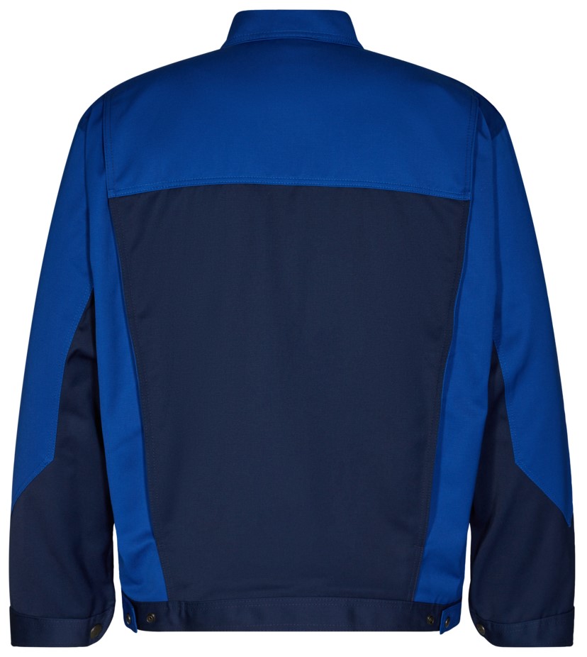 Arbeitsbundjacke mit verdecktem Kunststoffreißverschluss in passendem Farbdesign. Dunkel gefärbte Druckknöpfe. Brusttasche mit Patte und Klettverschluss links. Offene Brusttasche mit verschließbarer Handytasche rechts. Zwei Eingrifftaschen. Dreifach Kappnähte. Innentasche mit Patte. Verstärkte Oberarme. Bund und Manschetten verstellbar. Zwei Dehnfalten im Rücken für mehr Bewegungsfreiheit. Für Industriewäsche geeignet.