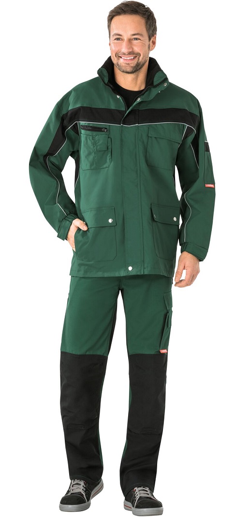Atmungsaktiv, wasserdicht, Nähte hinterklebt, Fleecekragen, Reflexbiesen als Sicherheitsausstattung, Kapuze im Kragen, 1 Brusttasche links mit Patte und Klettverschluss, doppelte Brust-tasche rechts, Handytasche auf der rechten Brust, 2 Stiftfächer, 2 seitliche Einschubtaschen, 2 aufgesetzte Seitentaschen, Ärmeltasche links, Dokumententasche unter der Frontpatte, Netzfutter innen, verdeckter Frontreißverschluss, mit Klettverschluss verstellbare Ärmelbündchen.