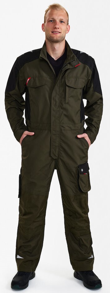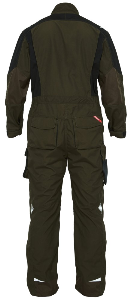 Funktionelle Overall mit vielen Details. Optimale Passform, u. a. sorgen ergonomisch geformte Knie, eine elastische Taille und Panel an der Innennaht im Schritt für mehr Bequemlichkeit. Verdeckter Reißverschluss vorn. Zwei Brusttasche mit Patte – die rechte mit Schlaufe und D-Ring zur Befestigung einer ID-Karte, die linke mit zusätzlicher Reißverschlusstasche fürs Handy. Verstellbare Ärmelbündchen. Zwei geräumige, schräg sitzende Einschubtaschen vorne. Zwei geräumige Gesäßtaschen mit Patte und Klettverschluss. Schenkeltasche mit Reißverschlusstasche und zusätzlicher kleiner Tasche. Sie ist geräumig und sorgt dank des freihängenden Bodens für mehr Bewegungsfreiheit. Unten verstärkte Zollstocktasche mit zusätzlichen Fächern. Auch die Zollstocktasche hat einen freihängenden Boden. Knieverstärkung/Knietasche mit Klettverschluss unten sowie zwei Einstellmöglichkeiten für Knieschutzkissen. Verstärkter Saum der Hosenbeine hinten sowie vorne und Verstärkung an den Ellenbogen für extra hohe Verschleißfestigkeit. Reflexstreifen an Schultern, Taille und Knien und unten an den Hosenbeinen für bessere Sichtbarkeit. Für Industriewäsche geeignet.
