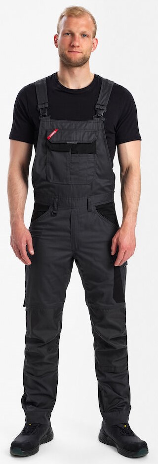 Zweifarbige Latzhose mit modernem Schnitt, bei der viel Wert auf eine gute Passform gelegt wurde. Die Latzhose ist aus einem Stoff gefertigt, der angenehm zu tragen ist, sowohl bei warmen als auch bei kälteren Temperaturen. Die Latzhose hat vorgeformte Knie für maximale Bewegungsfreiheit. Der praktische Gummizug hinten in der Taille sorgt zusammen mit dem breiten dehnbaren Rückenteil und den verstellbaren Trägern für eine besonders gute Passform. Man braucht sich nicht zu sorgen, dass sich die Arbeitskleidung z. B. beim Ausstrecken oder beim Bücken „teilt“. Bei der Entwicklung der Latzhose stand die Industrie im Mittelpunkt. Sie verfügt über alle erforderlichen funktionellen Details sowie über zusätzliche Details, die sie auch für andere Branchen geeignet macht. Die Latzhose hat besonders viele funktionelle Taschen, beispielsweise eine praktische Latztasche mit separater Handytasche sowie einen Stifthalter.Zwei geräumige schräge Taschen vorne. Gesäßtasche mit Klettverschluss. Auf der linken Seite befindet sich eine Oberschenkeltasche mit Patte und separater Handytasche. Auf der rechten Seite befindet sich eine Zollstocktasche mit lose hängendem Boden und Verstärkung. Die Latzhose hat zwei Einstellmöglichkeiten für das Einsetzen von Kniepolstern und eine zusätzliche Verstärkung an den Knien. Für eine bessere Sichtbarkeit und Sicherheit hat die Latzhose funktionelle reflektierende Details vorne und hinten. Die Latzhose hat einen besonders breiten Saum unten, der einfach ausgelassen werden kann, wenn zusätzliche Beinlänge erforderlich ist. Um die Hose zu verlängern, muss lediglich eine Naht aufgetrennt werden. Das Hosenbein ist trotzdem noch gesäumt.