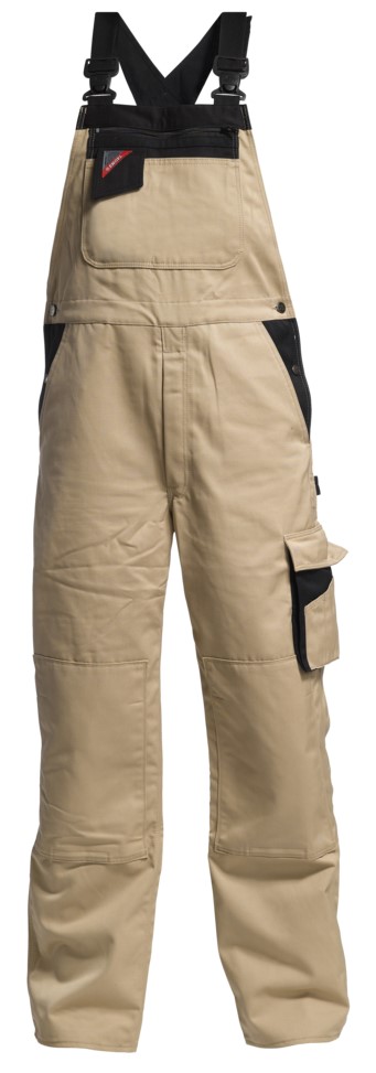 Arbeitslatzhose mit dreifachen Kappnähten. Hohes Rückenteil mit breitem, elastischem Zwischenstück. Schlagfeste Kunststoffschnallen. Zwei Einschubtaschen. Hosenschlitz mit Metallreißverschluss. Dunkel gefärbte Knöpfe. Verstellbare Bundweite. Große Brusttasche mit Reißverschluss. Kleine, offene Brusttasche mit verschließbarer Handytasche. Zwei verstärkte Gesäßtaschen, die Rechte mit Klettverschluss. Verstärkte Zollstocktasche mit Dehnfalte rechts. Schenkeltasche mit Dehnfalten und Patte mit Klettverschluss und zusätzlichen Bleistifttaschen links. Hammerschlaufe links. Knietaschen/Knieverstärkung mit Klettverschluss sowie zwei Verstellmöglichkeiten für eingelegte Kniekissen. Für Industriewäsche geeignet.