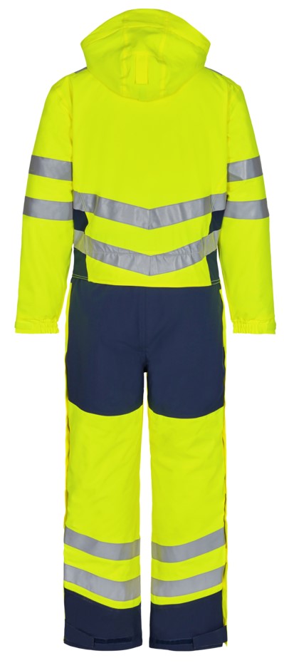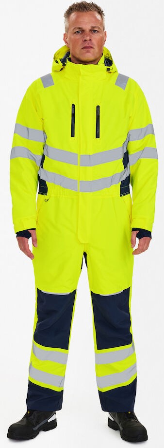 Fluoreszierende, atmungsaktive sowie wasser- und winddichte Winteroverall mit verschweißten Nähten und hohem Kragen im modernen Design. Doppelte Knopfleiste mit Reißverschluss sowie Klettverschluss vorne. Zwei geräumige Seitentaschen mit Klettverschluss. Zwei Brusttaschen und eine Reißverschluss-Handytasche, durch die man ein Kabel durchziehen kann. Abnehmbare Kapuze mit ausreichend Platz für den Arbeitshelm. Rippendetail im Lendenbereich hinten, das für gute Passform und Bewegungsfreiheit sorgt. Knieverstärkung. Verstellbare Bündchen an den Ärmeln und an den Hosenbeinen unten. Reißverschluss an der Außenseite beider Hosenbeine. Reißverschluss im Futter, geeignet für Aufdruck/Stickerei. Reflexstreifen über die Schulterpartie hinweg sowie rund um Ärmel, Taille und Beine. Bekleidungsklasse 3. Nach 50 mal Waschen getestet.