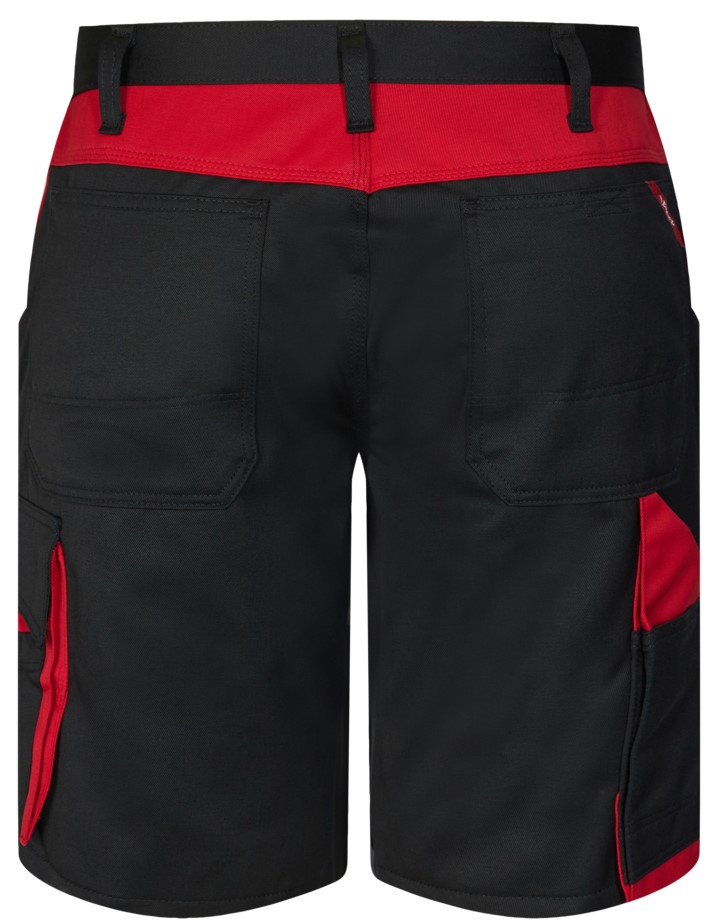 Arbeitsshorts mit dreifachen Kappnähten und Bundfalten. Zwei Eingrifftaschen und eine Münztasche. Hosenschlitz mit Metallreißverschluss. Dunkel gefärbter Metallhosenknopf. Zwei Gesäßtaschen, die Rechte mit Klettverschluss. Verstärkte Zollstocktasche mit Dehnfalte rechts. Schenkeltasche und Handytasche mit Dehnfalten und Patte mit Klettverschluss und zusätzlichen Bleistifttaschen links. Für Industriewäsche geeignet.