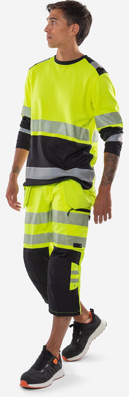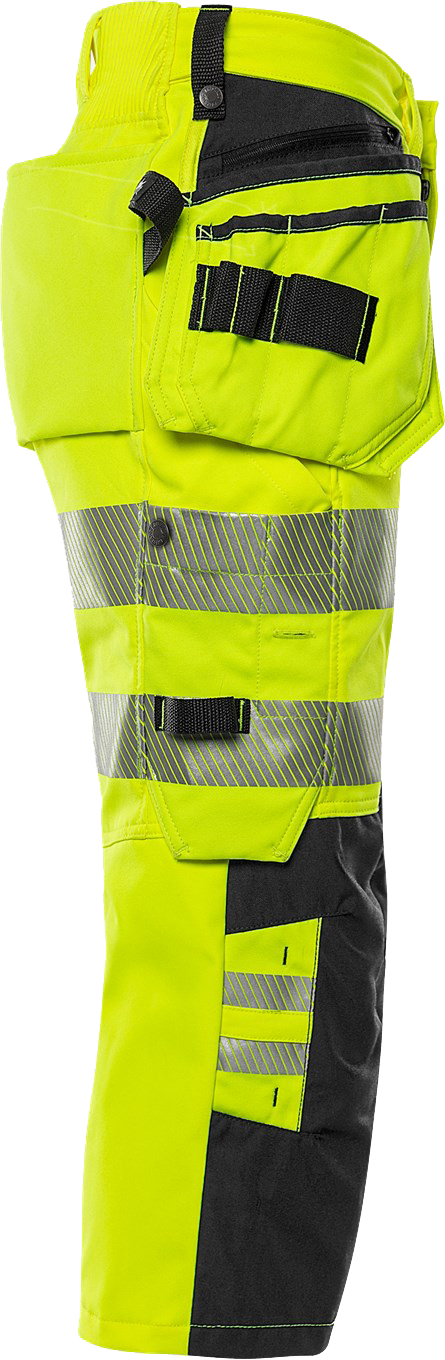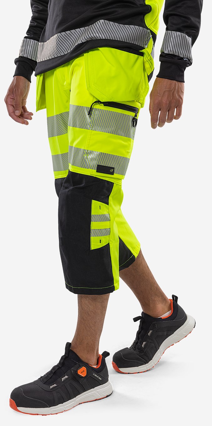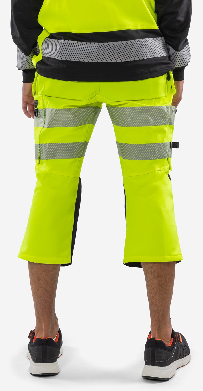 Warnschutz-3/4-Hose für Handwerker mit abnehmbaren, lose hängenden Taschen. Hergestellt aus 4-Wege-Stretch aus biobasiertem und recyceltem Material und ausgestattet mit Stretcheinsätzen an der Taille für hervorragenden Komfort. Konzept: Stiby
