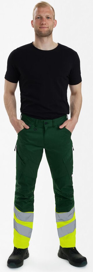 Dehnbare, funktionelle und fluoreszierende Hose im modernen Design. Optimale Passform mit u. a. ergonomisch geformtem Kniebereich. Der dehnbare Stoff sorgt für optimale Bewegungsfreiheit und Komfort. D-Ring vorne für die Befestigung von z. B. Ausweisen. Zwei geräumige Schrägtaschen vorne. Zwei Gesäßtaschen. Zwei Schenkeltaschen mit Reißverschluss. Die linke Schenkeltasche hat eine zusätzliche Handytasche. Die rechte Schenkeltasche hat eine aufgesetzte Zollstocktasche mit zusätzlichen Unterteilungen sowie eine Messertasche, beide Taschen sind verstärkt. Knieverstärkung/Knietasche mit Klettverschluss unten und besteht aus CORDURA®-Material. Reflexstreifen am Unterschenkel. Breiter Saum unten, der ausgelassen werden kann, wenn zusätzliche Beinlänge erforderlich ist. Um die Hose zu verlängern, muss lediglich eine Naht aufgetrennt werden. Das Hosenbein ist trotzdem noch gesäumt. Bekleidungsklasse 1. Nach 50 mal Waschen getestet.