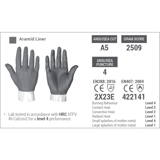 - EN407:2004 zertifiziert für Brennverhalten Stufe 4, Kontaktwärme Stufe 2, konvektive Wärme Stufe 2, Strahlungswärme Stufe 2, kleine Spritzer von geschmolzenem Metall Stufe 4 und große Spritzer von geschmolzenem Metall Stufe 1