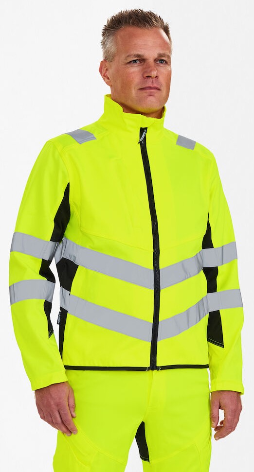 Dehnbare und funktionelle fluoreszierende Arbeitsjacke im modernen Design. Die Jacke hat einen hohen Kragen und ist hinten länger geschnitten. Der dehnbare Stoff bietet viel Komfort und Bewegungsfreiheit. Reißverschluss vorne. Zwei geräumige Seitentaschen sowie eine Brusttasche, jeweils mit Reißverschluss. Zusätzlicher Windfang aus Rippstrick an den Ärmeln. Der Windfang mit Daumenloch kann zum Schutz vor Kälte über die Hand gezogen werden. Reflexstreifen über die Schulterpartie hinweg sowie rund um Ärmel und Taille. Bekleidungsklasse 2. Nach 50 mal Waschen getestet.