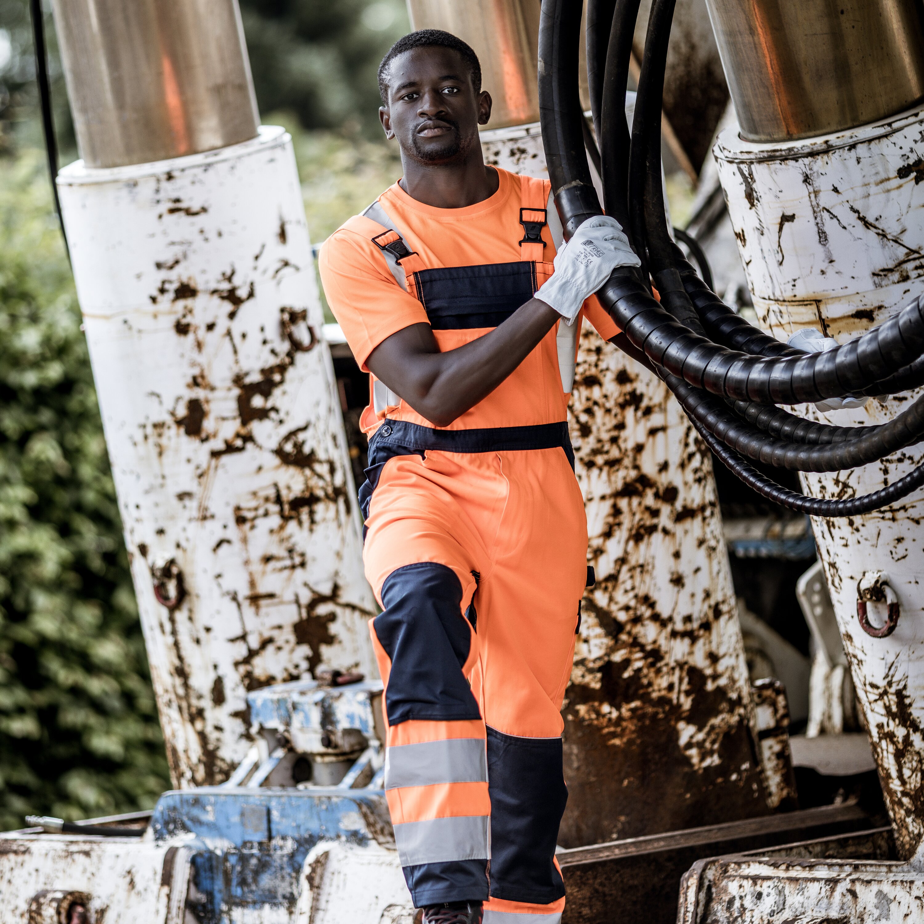 - Knie-, Gesäßtaschen und Latz-Außentaschen, umlaufende Reflexstreifen und Reflexbiesen an den Seiten- und Knietaschen für besonders gute Sichtbarkeit