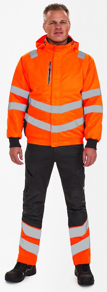 Fluoreszierende, wind- und wasserabweisende Pilotenjacke mit modernem Schnitt. Hoher Kragen mit Fleece innen. Doppelte Knopfleiste mit Reißverschluss sowie Klettverschluss vorne. Zwei geräumige Seitentaschen sowie Brusttasche mit Reißverschluss. Zwei Innentaschen, eine davon mit Reißverschluss. Abnehmbare, verstellbare Kapuze mit ausreichend Platz für den Arbeitshelm. Elastischer Saum unten und Rippstrick am Ärmelabschluss. Reißverschluss im Futter, der sich für Aufdruck/Stickerei eignet. Reflexstreifen über der Schulterpartie sowie rund um Ärmel und Taille. Bekleidungsklasse 3. Getestet nach 50 Wäschen.
