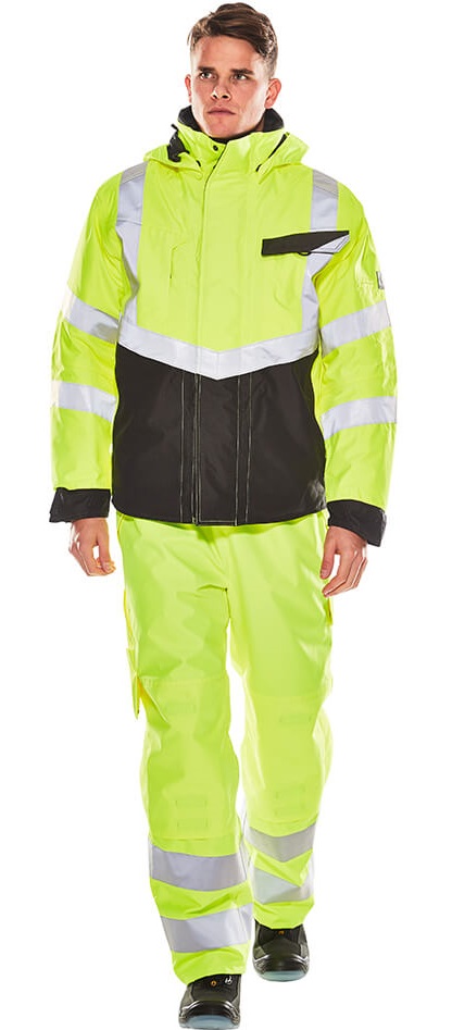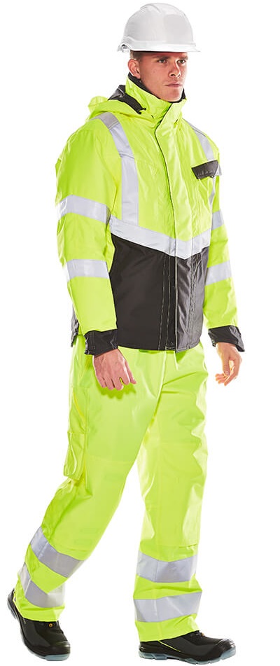 - Fluoreszierend und mit Reflexschulterstreifen sowie schräg verlaufenden Reflexen