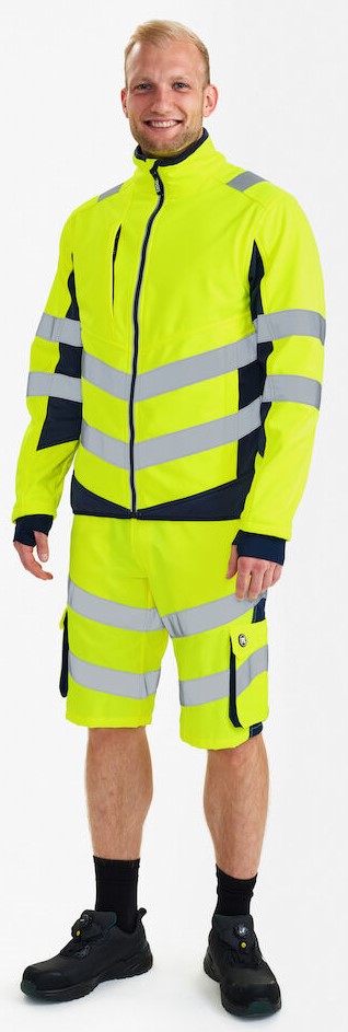 Funktionelle, fluoreszierende Softshelljacke im modernen, attraktiven Design mit wind- und wasserabweisenden Eigenschaften. Die Jacke ist innen und am Kragen mit Fleece gefüttert, und daher weich und angenehm auf der Haut. Stretch Qualität, die für Komfort und Bewegungsfreiheit sorgt. Reflektierender Reißverschluss vorne. Zwei geräumige Seitentaschen sowie eine Brusttasche, jeweils mit Reißverschluss. Zwei große Innentaschen mit Klettverschluss. Die Jacke hat einen elastischen Bund unten. Ärmel mit elastischem Windfang mit Daumenöffnung. Ärmel mit elastischem Windfang mit Daumenöffnung. Zusätzlicher Windfang aus elastischem Material in den Ärmeln. Der Windfang mit Daumenöffnung kann zum Schutz vor Kälte über die Hand gezogen werden. Reflexstreifen über die Schulterpartie hinweg sowie rund um Ärmel und Taille. Bekleidungsklasse 2. Nach 25 mal Waschen getestet.