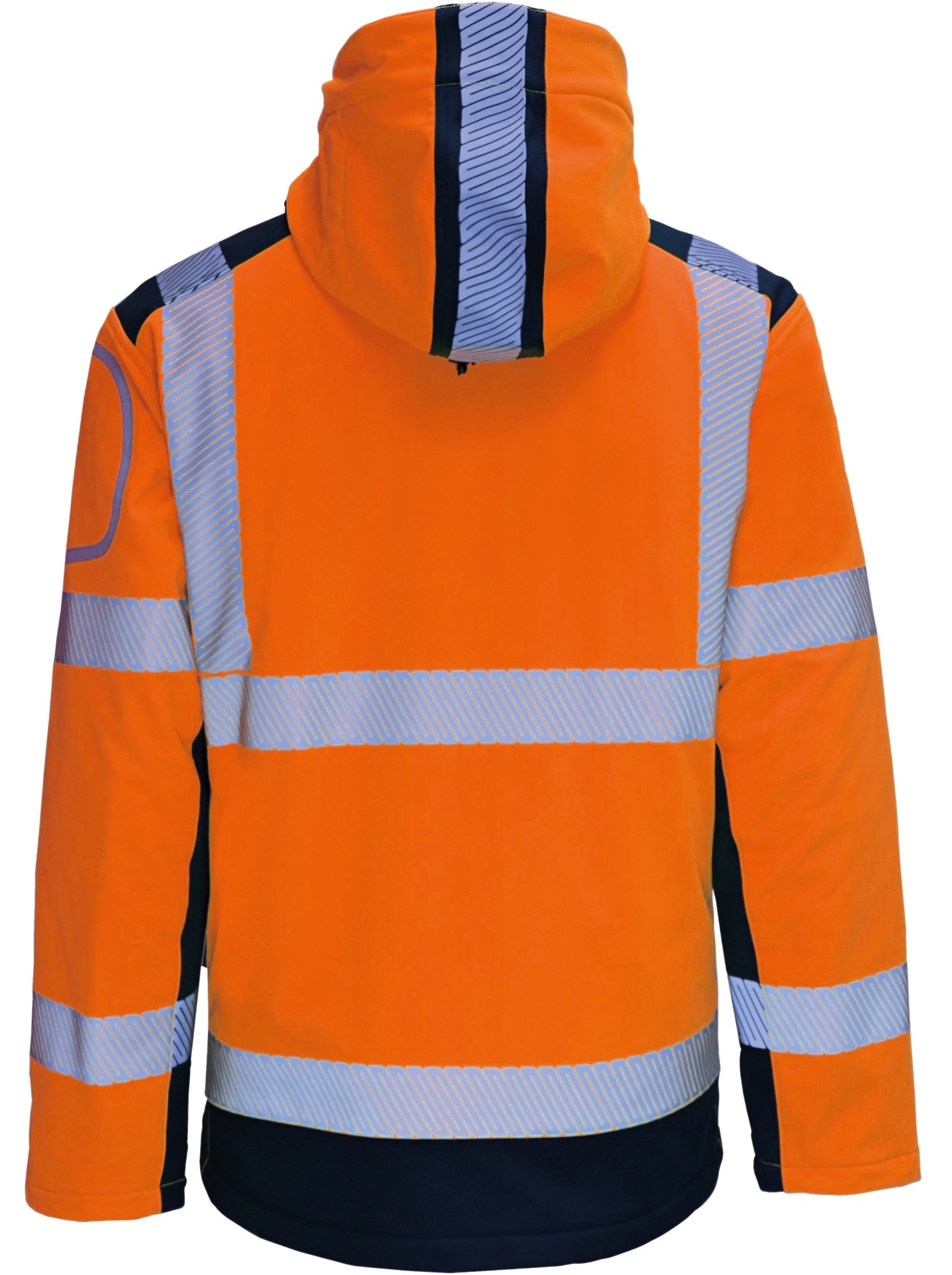 robustes 3-Lagenlaminat-Softshell Twill/TPU-Membran/Mikrofleece, herrausnehmbare Stepp-Innenjacke mit Strickbündchen für effektiven Kälteschutz, auch einzeln tragbar, je 2 x 5 cm breite Reflektorstreifen umlaufend am Rumpf und den Armen sowie je 1 x 5 cm an den Schultern, segmentiert für höhere Dehnbarkeit, abtrennbare, verstellbare Kapuze (längs und quer), Frontverschluss mit verdecktem Reißverschluss und Klettverschluss sowie Untertritt und Kinnschutz, verstellbare Ärmelbündchen mit Klettverschluss, Kontrasteinsätze in marineblau