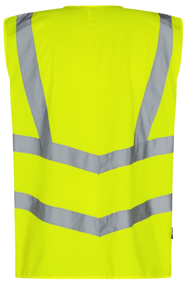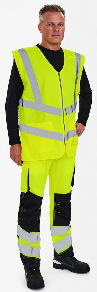 Leichte, bequeme Verkehrsweste mit Frontreißverschluss. Zwei große Außentaschen mit Klettverschluss. ID-Kartenhalter an der linken Tasche. Schlaufe, z. B. für Walkie-Talkie oder Gaswarngerät, an der linken Brustseite. Reflexstreifen am Torso und über den Schultern. Bekleidungsklasse 2. Nach 25 mal Waschen getestet.