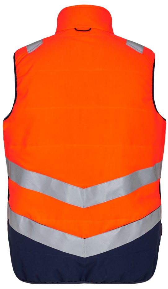 Warme, fluoreszierende Weste im modernen Design mit wind- und wasserabweisenden Eigenschaften. Die Weste kann mit den Modellen 1146-930 kombiniert werden, die einen Reißverschluss zum Einzippen haben. Reflektierender Reißverschluss vorne. Zwei Seitentaschen sowie Brusttasche mit Reißverschluss. Die Weste hat unten und am Armloch ein elastisches Bündchen. Reflexstreifen über die Schulterpartie hinweg sowie rund um die Taille. Bekleidungsklasse 1. Nach 50 mal Waschen getestet.