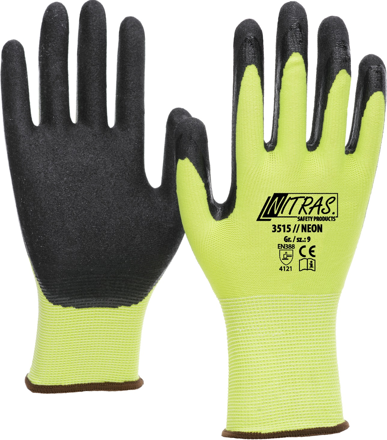 NITRAS NEON, Polyesterhandschuhe, neongelb, gesandete Nitril-Beschichtung, schwarz, teilbeschichtet auf Innenhand und Fingerkuppen, Strickbund
