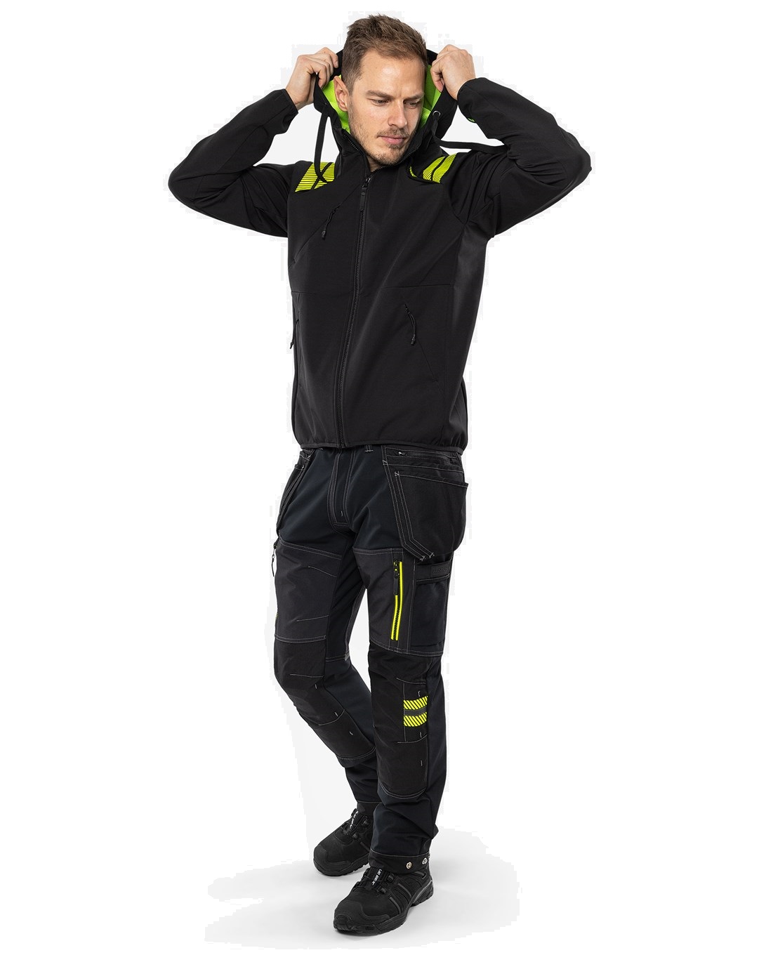 Functional softshell jacket with hood for modern craftsmen. Windproof, water-repellent and breathable stretch jacket for optimum freedom of movement and comfort. Can be worn all year round. Concept: Tyresta