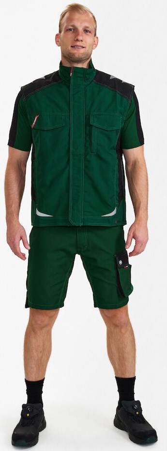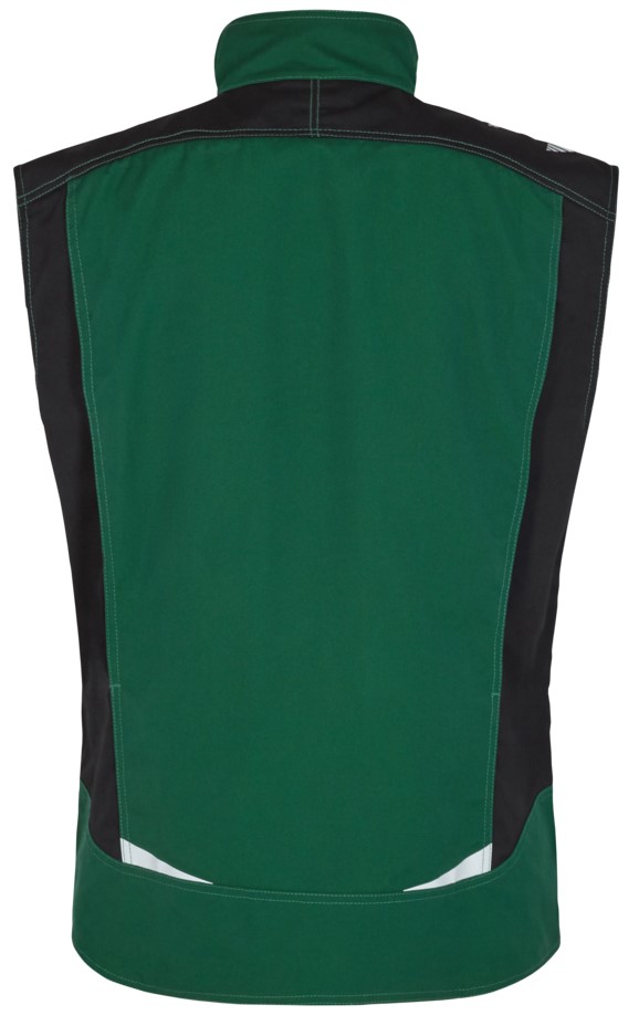 Functional service vest with many details. Extended back section with movement pleat. Concealed front zipper Two spacious slit pockets. Two breast pockets with flaps - the right-hand one with a loop and D-ring for attaching an ID card, the left-hand one with an additional zipped pocket for a cell phone. Two large inside pockets with Velcro fastener. Reflective stripes on the shoulders, front and back for increased visibility. Suitable for industrial laundering.