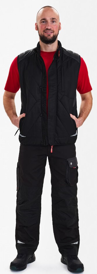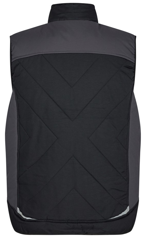 Warm winter vest with high collar and extended back. Soft microfleece inside the collar. Front zipper. Two spacious slit pockets and one breast pocket, all with zippers. Inner pocket also with zipper. The vest has an elasticated waistband and arm openings to reduce wind penetration.