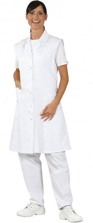 Sleeveless, princess shape, 3/4 long, collar with lapel, press stud placket, 2 side pockets, back strap.