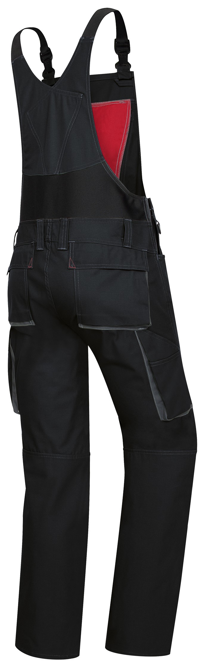 stretch straps with plastic buckles, double bib pocket with zipper and pocket flap, 2 pen pockets, high back with stretch insert for more freedom of movement, adjustable waist size