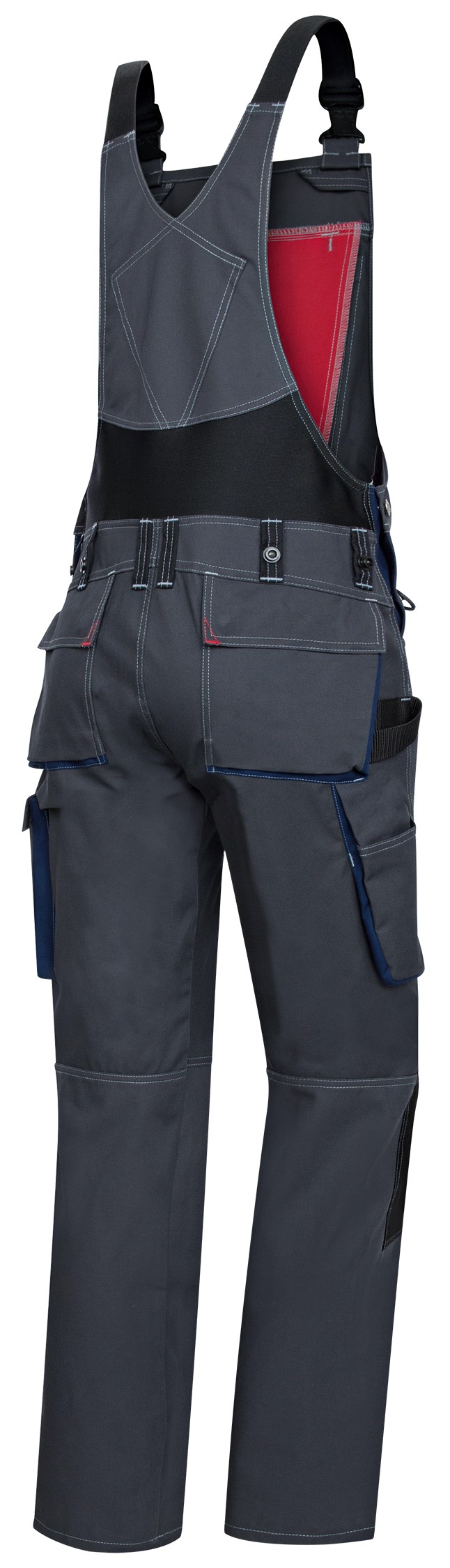 stretch straps with plastic buckles, double bib pocket with zipper and pocket flap, 2 pen pockets, high back with stretch insert for more freedom of movement, adjustable waist size
