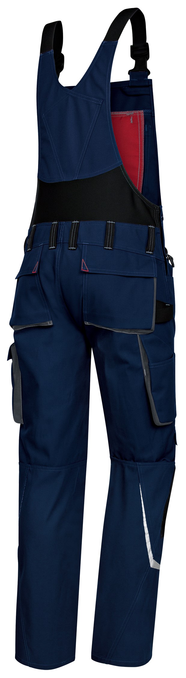 stretch straps with plastic buckles, double bib pocket with zipper and pocket flap, 2 pen pockets, high back with stretch insert for more freedom of movement, adjustable waist size