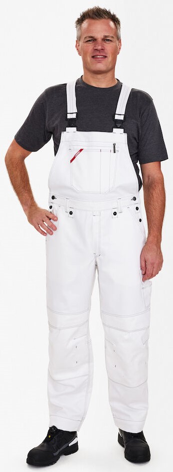 Functional dungarees with contrasting topstitching. High-cut back with wide elasticated waistband and adjustable straps. Chest pocket with compartments for pens and chest pocket with zipper. Optimum fit, ergonomically shaped knees. Adjustable waist size. Two spacious, slanted slit pockets at the front. Two back pockets with flap. Thigh pocket with flap and inserts for pens, for example. Free-hanging, reinforced folding rule pocket with extra compartments guarantees optimum freedom of movement. Adjustable hammer loop. Reinforced knee pocket with two adjustment options for knee pads. Reinforced hem on trouser legs for extra wear resistance. High visibility thanks to reflective piping in the middle of the back of the trouser legs. The trouser legs have an extra wide turn-up so that the inseam can be extended if required. For an extra-long leg length, simply open one hem, which conceals an additional hem.