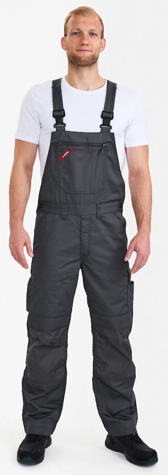 Functional dungarees with contrasting topstitching. High-cut back with wide elasticated waistband and adjustable straps. Chest pocket with compartments for pens and chest pocket with zipper. Optimum fit, ergonomically shaped knees. Adjustable waist size. Two spacious, slanted slit pockets at the front. Two back pockets with flap. Thigh pocket with flap and inserts for pens, for example. Free-hanging, reinforced folding rule pocket with extra compartments guarantees optimum freedom of movement. Adjustable hammer loop. Reinforced knee pocket with two adjustment options for knee pads. Reinforced hem on trouser legs for extra wear resistance. High visibility thanks to reflective piping in the middle of the back of the trouser legs. The trouser legs have an extra wide turn-up so that the inseam can be extended if required. For an extra-long leg length, simply open one hem, which conceals an additional hem.