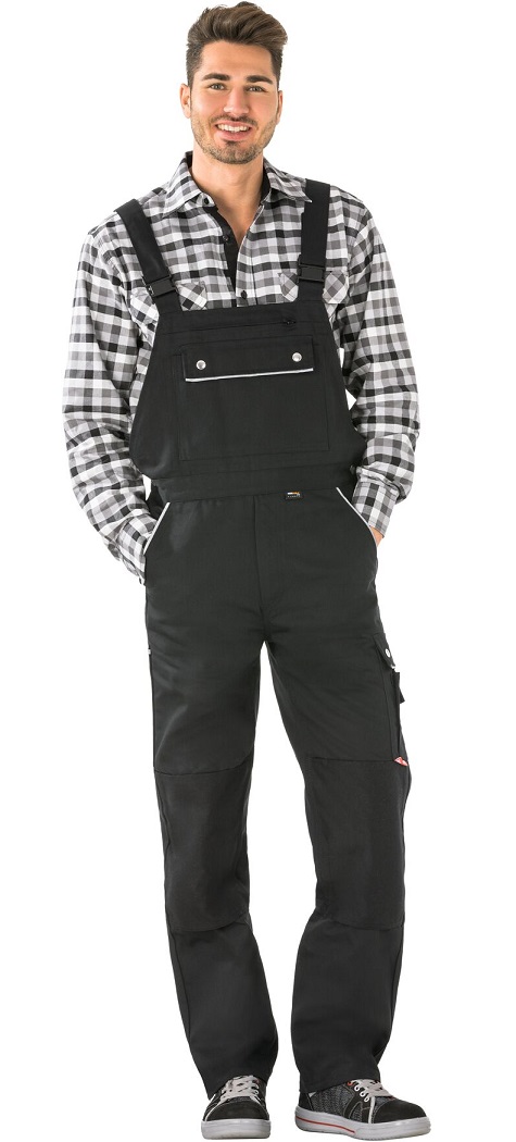 This article, in conjunction with a knee PLANAMpad (Art. No. 9901027), is certified as knee protection according to EN 14404 Type 2, Level 1. Knee pockets made of Cordura®, 2 set-in pouch pockets made of Cordura®, double ruler pocket made of Cordura® on the right, reflective piping on pocket openings and pocket flaps, thigh pocket on the left with flap and press studs, mobile phone pocket on top, double bib pocket, 1 with flap and press studs and 1 with zip, elasticated waistband, 1 reinforced hip pocket on the right, waistband width adjustment with jeans button, zip in trouser fly, raised back with cross straps, straps with elasticated elastic band insert, safety buckle on the straps.