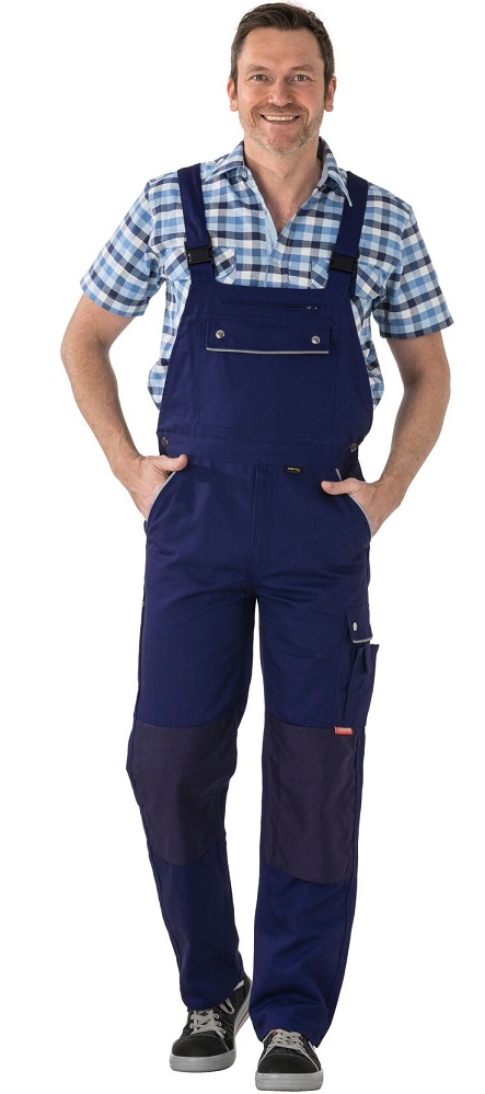 This article, in conjunction with a knee PLANAMpad (Art. No. 9901027), is certified as knee protection according to EN 14404 Type 2, Level 1. Knee pockets made of Cordura®, 2 set-in pouch pockets made of Cordura®, double ruler pocket made of Cordura® on the right, reflective piping on pocket openings and pocket flaps, thigh pocket on the left with flap and press studs, mobile phone pocket on top, double bib pocket, 1 with flap and press studs and 1 with zip, elasticated waistband, 1 reinforced hip pocket on the right, waistband width adjustment with jeans button, zip in trouser fly, raised back with cross straps, straps with elasticated elastic band insert, safety buckle on the straps.