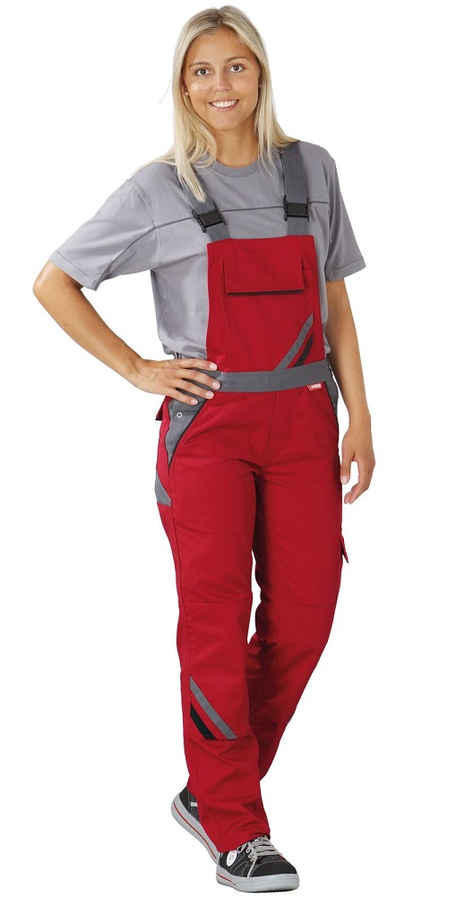 This article is certified as knee protection according to EN 14404 type 2, level 1 in combination with a knee PLANAMpad (art. no. 9901027). 2 set-in pouch pockets, 2 patch knee pockets with coloured applications, double ruler pocket, left thigh pocket with flap and Velcro closure, bib pocket with flap and Velcro closure, coloured applications on bib pocket, elasticated waistband, 2 hip pockets with flaps, waist width adjustment with concealed press stud, raised back with cross straps, straps with elastic elastic band insert, safety buckle on the straps, pocket openings and pocket flaps with coloured piping.
