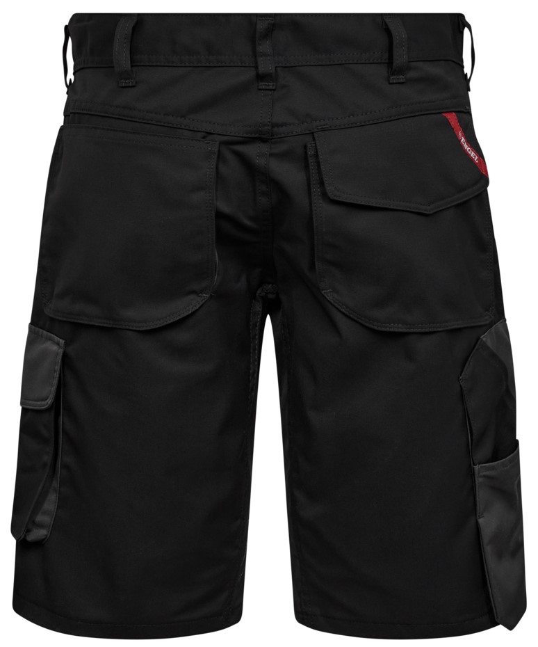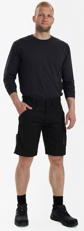 Functional work shorts with many details. Optimum fit, with panel on the inseam at the crotch for greater comfort. Two spacious, slanted slit pockets at the front. Loop with D-ring (front) for attaching an ID card. Two spacious back pockets, the right one with flap and Velcro fastener. Very spacious thigh pocket with zipper pocket, e.g. for a cell phone, and additional small pocket. Folding rule pocket with additional compartments. The ruler pocket has a free-hanging bottom for greater freedom of movement. Suitable for industrial laundering.