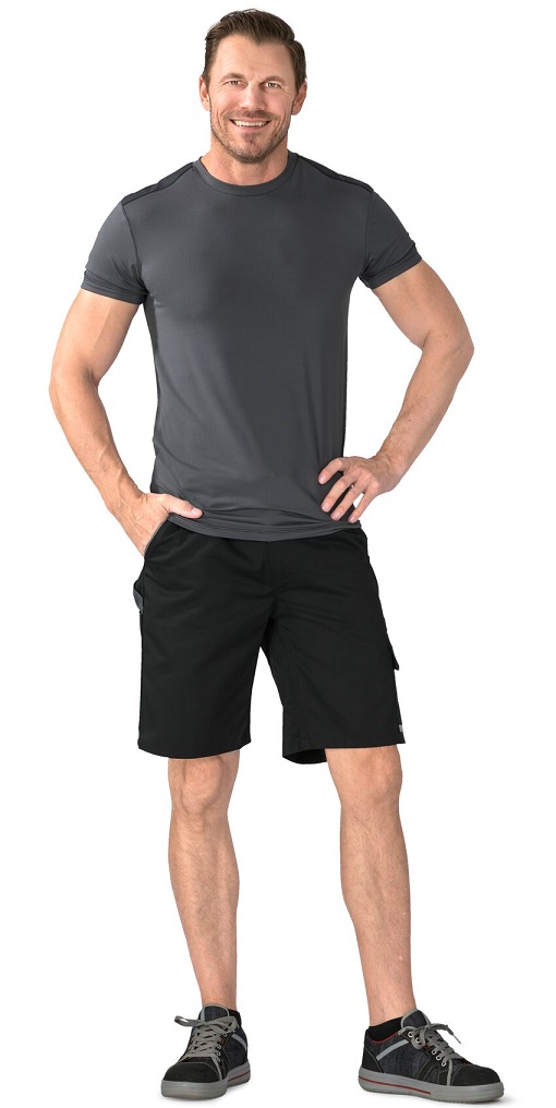 2 set-in pouch pockets, double ruler pocket, left thigh pocket with flap and Velcro fastener, mobile phone pocket, elastic waistband, 2 back pockets with flaps, zipper in trouser fly, pocket openings and pocket flaps with colored piping set off.
