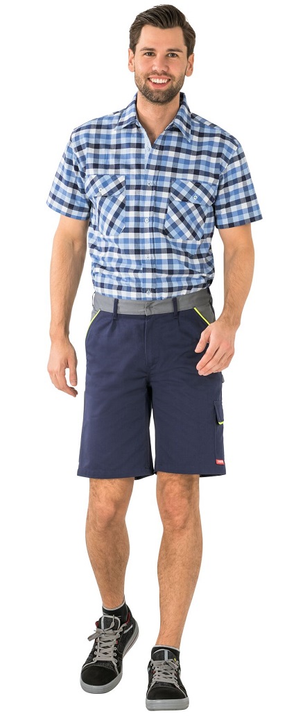2 set-in pouch pockets, double ruler pocket, left thigh pocket with flap and Velcro fastener, mobile phone pocket, elastic waistband, 2 hip pockets with flaps, zip in trouser fly, pocket openings and pocket flaps with coloured piping.