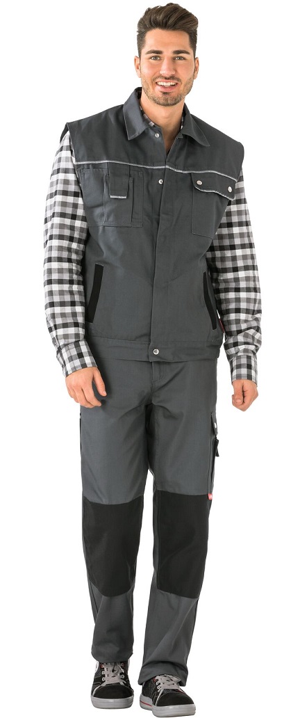 2 set-in Cordura® pouch pockets, reflective piping on shoulder saddle and pocket flaps, 2 breast pockets, left with flap and press studs, right with additional mobile phone pocket, elasticated waistband, concealed press stud front closure, hanger in collar.