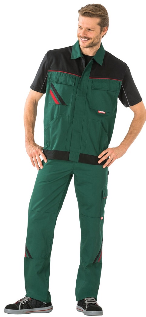 2 patch side pockets, 2 breast pockets with flap and Velcro, color applications on the right breast pocket, elastic waistband, concealed front zipper, piping on the saddle, 2 golf pleats in the back.