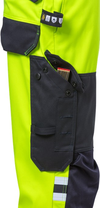 Flame protection trousers made of a lightweight and durable stretch material. High-visibility trousers with built-in flame protection, offering both optimum safety and excellent freedom of movement. Approved for 50 washes in the heavy duty laundry.