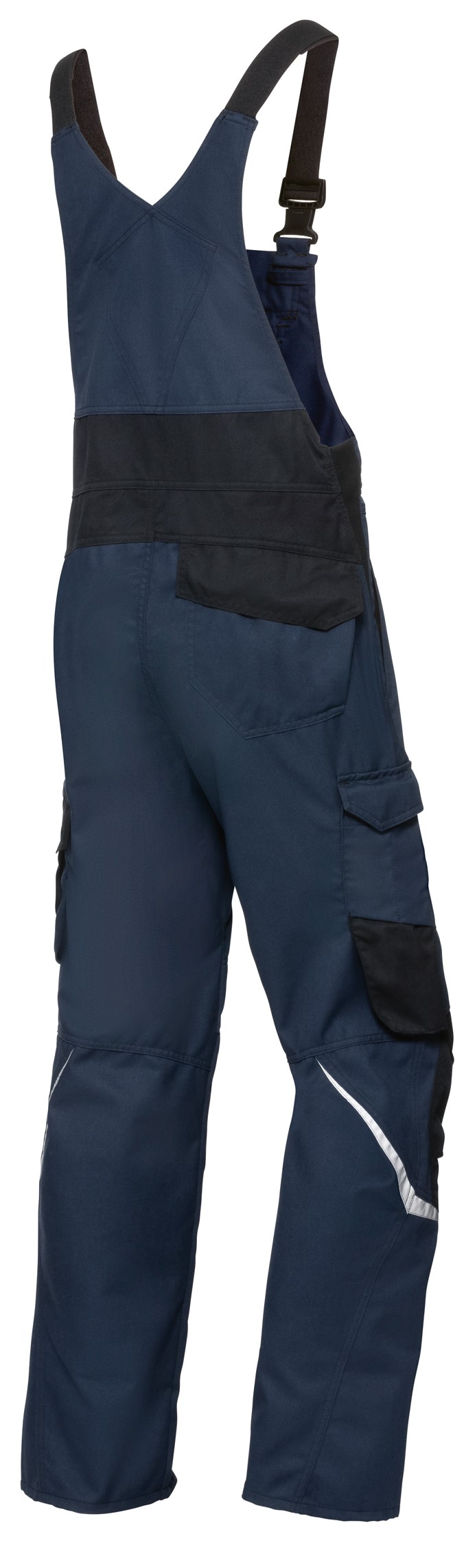stretch straps with plastic buckles, double bib pocket with zipper and pocket flap, high back, ergonomic cut, 2 side pockets