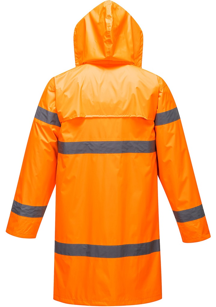 Designed for full protection from the wet with a back length of 100 cm, this coat guarantees you visibility, safety and dryness. The practical features include a 2-way zipper under flap, a hood rolled into the collar, large front pockets for ample storage space and a ventilated back section as well as eyelets under the acgsels for increased breathability. 190T EssentialsThis fabric is made from a 190T, 100% polyester yarn in plain weave, therefore it is durable and robust even in harsh conditions. The fabric is lightweight and offers the best abrasion and tear resistance. The PVC coating on the inside makes the fabric waterprooferdiand the water- and dirt-repellent finish on the outside keeps the garment clean for a long time.Warning Protection Our extensive warning protection collection, meets the highest requirements in design and workmanship to ensure that the items comply with the latest standards EN ISO 20471 & ANSI. Innovative and technical, our warning collection is ideal for t