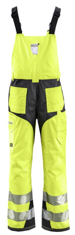 fit thanks to ergonomic cut close to the body in combination with stretch inserts. The resilient Twillfabric is pleasantly soft and supple at the same time. Segmented 7 cm wide reflective stripes, which are printed directly on, around the legs. Dark, stepped reflex fabric on the inner leg, buttocks and pocket openings prevent soiling. Knee pockets for upholstery, as well as pocket bottoms and trouser hems made of abrasion-resistant Oxford fabric. Large cargo pocket on left trouser leg with front mobile phone and pen pocket. 2 front pockets, 2 back pockets, one with and one without pocket flap. Ruler pocket and hammer loop on the right rear leg side. Bib with attached, large flap pocket. Elastic suspenders with adjustable buckles for length adjustment.Standards:PPE Category II (Protection against medium risks)EN ISO 13688 - Protective clothing, general requirementsEN ISO 20471 - High visibility warning clothing, Class 2(minimum visible material area: background material min 0,5 m², re