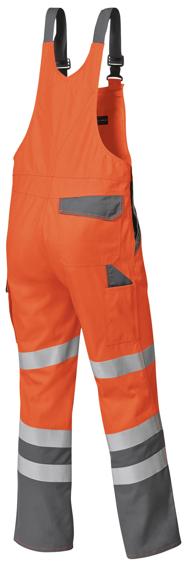 Stretch straps with plastic buckles, double bib pocket closable with flap, 1 of them with concealed zipper, 2 pen pockets, 2 side pockets, thigh pocket with attached smartphone and pen pocket, thigh and smartphone pocket closable with flap, high back, double folding rule pocket, 1 back pocket closable with flap