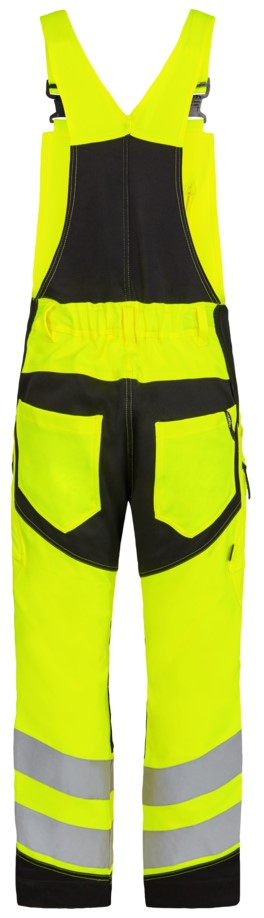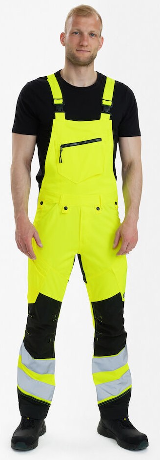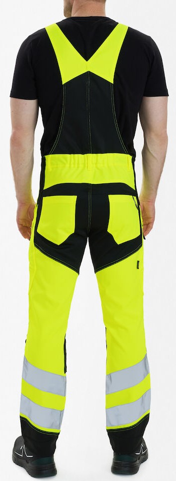 Stretchy and functional fluorescent dungarees in a modern design. The stretchy fabric ensures optimum freedom of movement and comfort. Optimum fit with ergonomically shaped knee area. High-cut back and ribbed knit inserts on the sides ensure optimum fit and comfort. Adjustable straps. Bib pocket with zipper. Inner bib pocket with zipper. Two back pockets. Two thigh pockets with zipper. The left thigh pocket has an additional cell phone pocket. The right thigh pocket has a patch ruler pocket with additional dividers. D-ring on the bib pocket for attaching ID cards, for example. Knee reinforcement/knee pocket with Velcro fastener at the bottom and made of CORDURA® material. Wide bottom hem that can be left out if extra leg length is required. Only one seam needs to be undone to lengthen the trousers. The trouser leg is still hemmed. Clothing class 2, tested after 50 washes