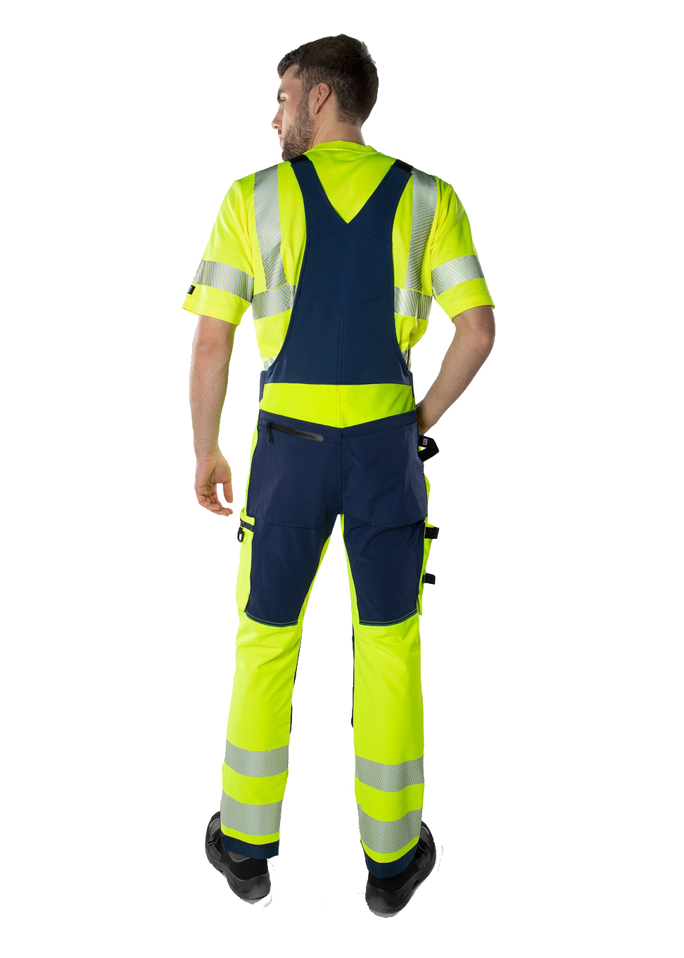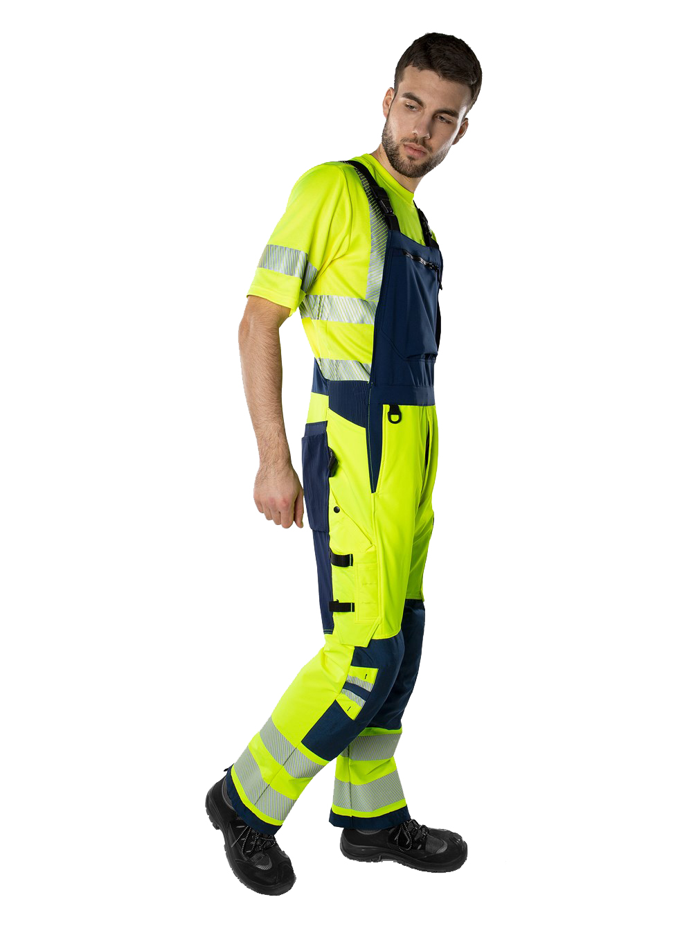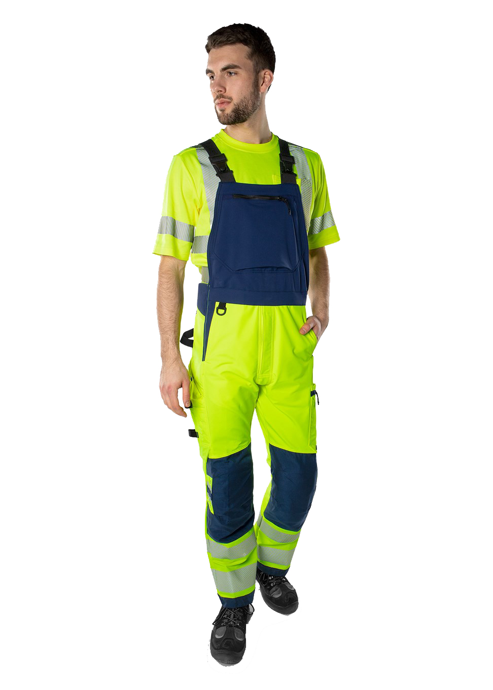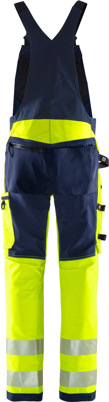 Sustainable, high-visibility stretch dungarees made from 4-way stretch material with stretch inserts at the waistband. Made from bio-based and recycled materials and reinforced in exposed areas. With EPD (Environmental Product Declaration). Concept: Stiby