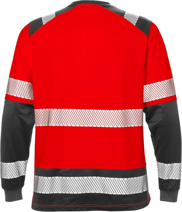 Long-sleeved high-visibility T-shirt with elastic reflective tape for extra freedom of movement. Made of a soft and comfortable material with cotton on the inside. Wicks moisture, dries quickly and is UV protected. Contrast areas where the T-shirt is most exposed to dirt and soil.