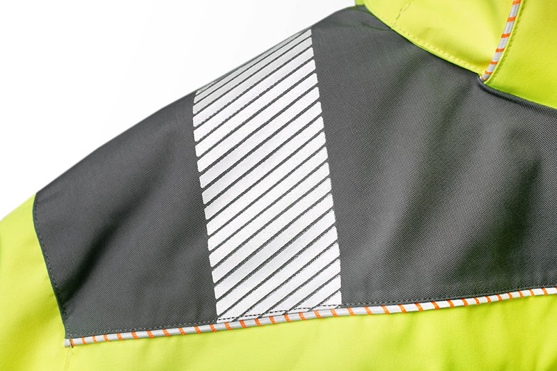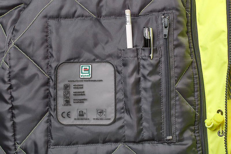 Standard EN ISO 20471 Class 3 EN 343 Class 3/3, EN ISO 13688 Upper 100% polyester, Oxford, highly breathable PU coating Sizes S-XXXXL Colour fluorescent yellow, grey contrasted Breathability 5.000 g/m²/24h Water column 10.000 mm Reinforcement 100% polyamide, (Cordura®) Lining 100% polyester Padding 100% polyester high quality and efficient jacket wind and watererdi, highly breathable Welded seams thermofixed reflective strips, thus no additional seams Reflective strip made of 3MScotchlite 5510 Reflective material robust Oxford fabric: oil- and dirt-repellent, highly abrasion- and tear-resistant Cordura® inserts on sleeves, shoulder and hem ensure long durability concealed 2-way YKK® front zip with Velcro fasteners removable, warming quilted lining with knitted cuffs at the cuffs modern and ergonomic fit Movement folds in the back Forearm ventilation with zippers adjustable waist, hem and sleeve hem detachable storm hood with fleece lining easy emblem application due