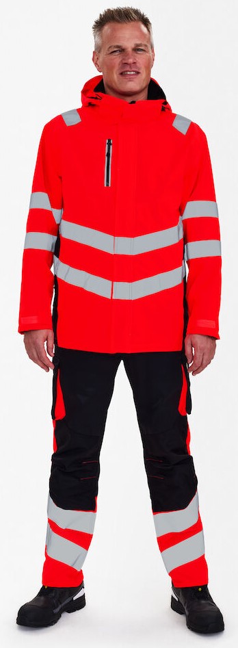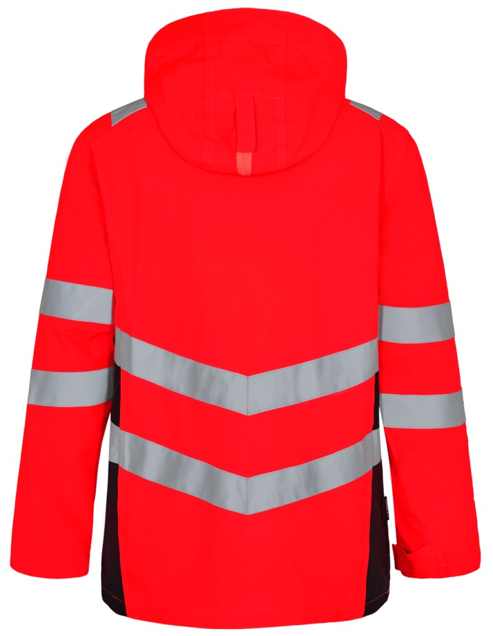 Fluorescent, breathable, waterproof and windproof shell parka with a modern cut and taped seams. The parka has a high collar, double button placket with zipper and Velcro fastening at the front. Can be combined with the 1192-236, 1159-158 and 5159-158 models, which all have zip-in details. Two spacious side pockets and chest pocket with zipper as well as large inside pockets with Velcro fastening. Detachable, adjustable hood with sufficient space for a work helmet. Adjustable cuffs. Zipper in the lining suitable for printing. Reflective stripes over the shoulders and around the sleeves and waist. Clothing class 3, tested after 50 washes.